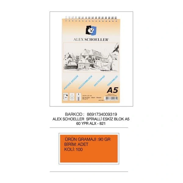 Alex Schoeller Eskiz Blok Spiralli Dikey 60 Yp 90 Gr A5 Alx-821
