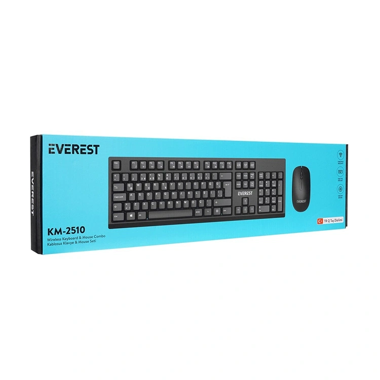 Everest KM-2510 Siyah Kablosuz Q Multimedia Klavye + Mouse Set, ev ve ofis kullanımı için tasarlanmış pratik ve ekonomik bir kablosuz set çözümüdür. Ergonomik yapısı, multimedya tuşları ve kompakt tasarımı sayesinde uzun süreli kullanımlarda konfor sağlar.