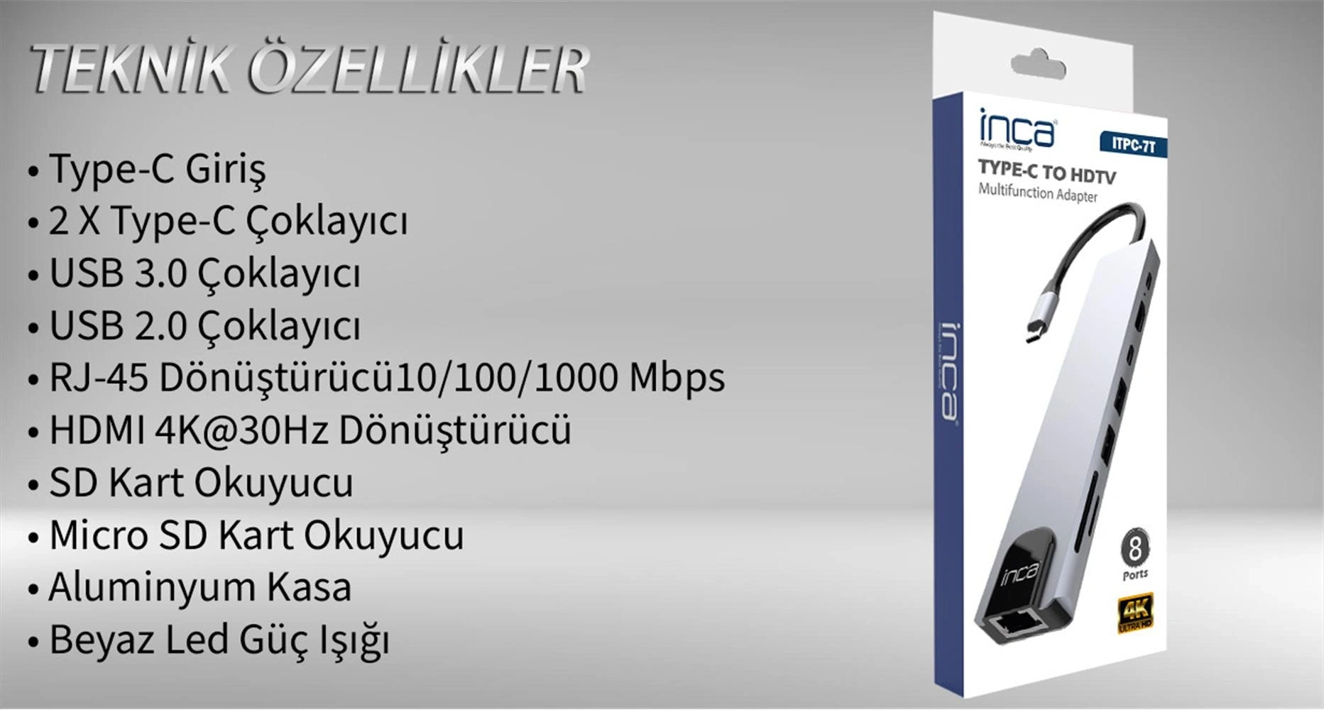 Inca Itpc-7t Type-c Giriş 2xtype-c Çoklayıcı Rj-45 Hdmı 4k@30 Usb 3.0 Çoklayıcı Micro Sd Kart
