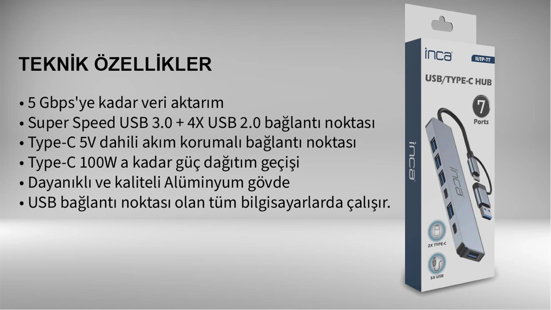 Inca Iutp-7t Usb+type-c Girişli Usb 3.0+4x Usb 2.0 Type-c 5v 2x Type-c 100w Çoklayıcı
