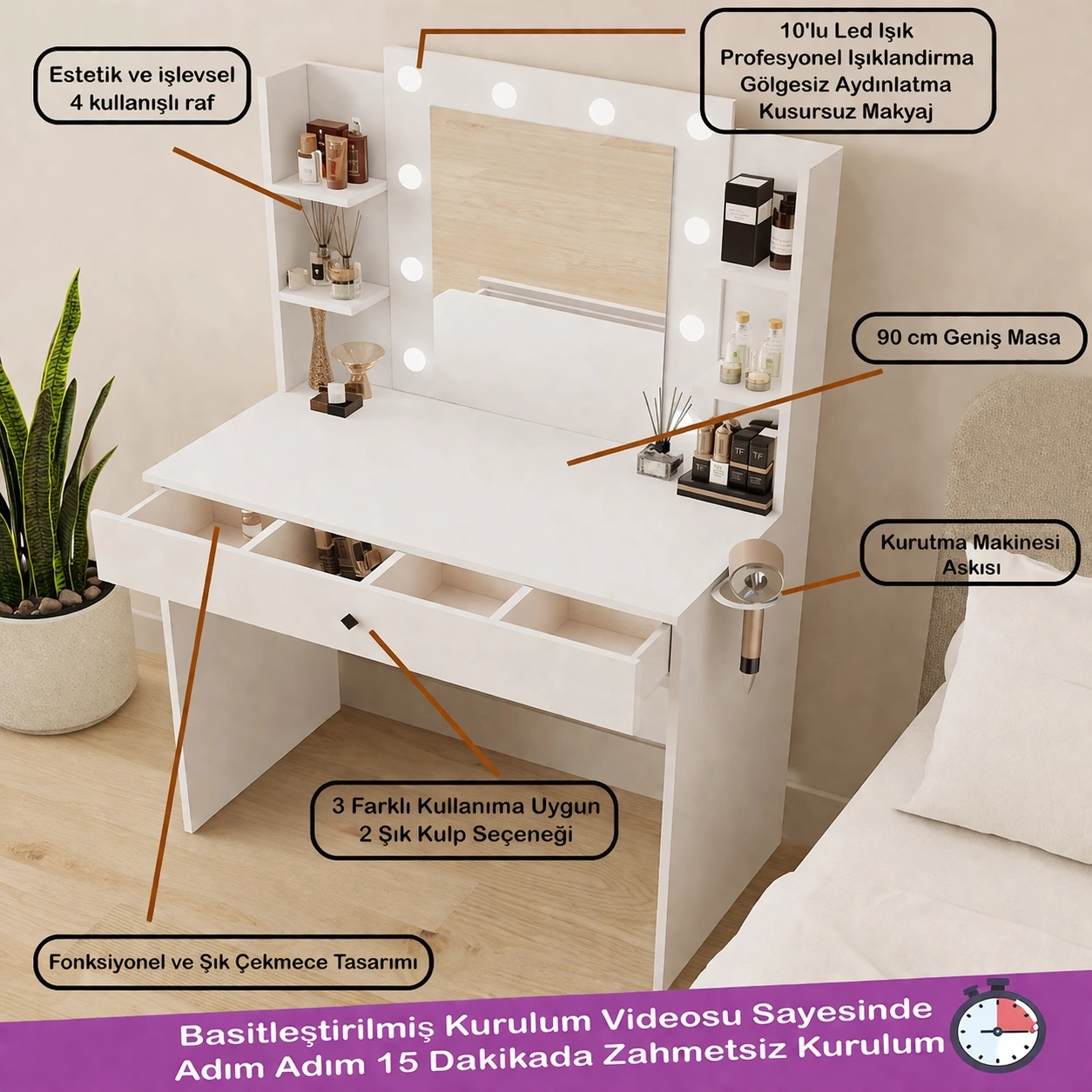 Makyaj Masası: Genişlik: 90 cm - Derinlik: 45 cm - Yükseklik: 76,8 cm
